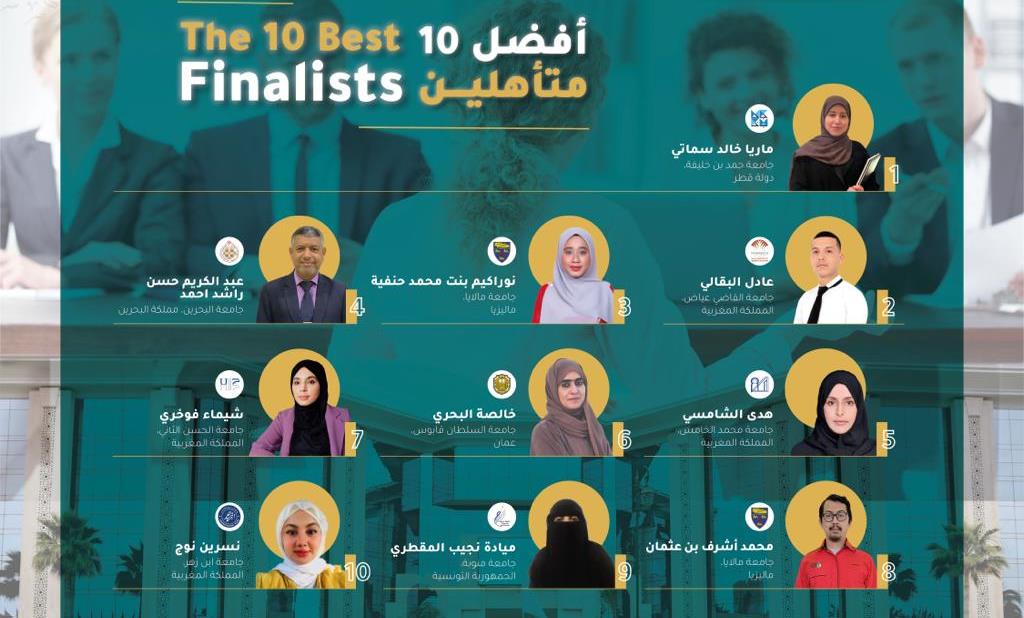 وضمت القائمة المتأهلين لهذه النهائيات التي ستجرى أطوارها غدا الأربعاء بالرباط، كلا من عادل البقالي من جامعة القاضي عياض بمراكش، وهدى الشامسي من جامعة محمد الخامس بالرباط، وشيماء فوخري من جامعة الحسن الثاني بالدار البيضاء، ونسرين نوح من جامعة ابن زهر بأكادير.