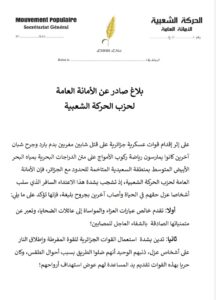 على إثر إقدام قوات عسكرية جزائرية على قتل شابين مغربين بدم بارد وجرح شبان آخرين كانوا يمارسون رياضة ركوب الأمواج على متن الدراجات البحرية بمياه البحر الأبيض المتوسط بمنطقة السعيدية المتاخمة للحدود مع الجزائر، فإن الأمانة العامة لحزب الحركة الشعبية، إذ تشجب بشدة هذا الاعتداء السافر الذي سلب أشخاصا عزل حقهم في الحياة وأصاب آخرين بجروح بليغة، فإنها تؤكد على ما يلي:
