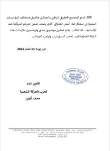 ثالثا: تدعو المجتمع الحقوقي الوطني والجزائري والدولي ومختلف المؤسسات المعنية إلى استنكار هذا العمل العدواني الذي يصنف ضمن الجرائم المرتكبة ضد الإنسانية ، كما تطالب بفتح تحقيق موضوعي جدي ونزيه حول ملابسات هذه النازلة الخطيرة قصد تحديد المسؤوليات وترتيب الجزاءات.