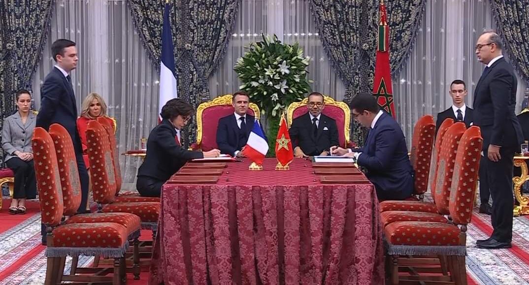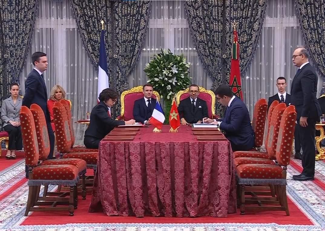 وترأس الملك محمد السادس، مرفوقا بولي العهد الأمير مولاي الحسن، والأمير مولاي رشيد، والأميرة للاخديجة والأميرة للا مريم، والرئيس الفرنسي، إيمانويل ماكرون مرفوقا بحرمه بريجيت ماكرون، مساء اليوم الإثنين بقصر الضيافة بالرباط، حفل التوقيع على عدد من الاتفاقيات بين المملكة المغربية والجمهورية الفرنسية.
