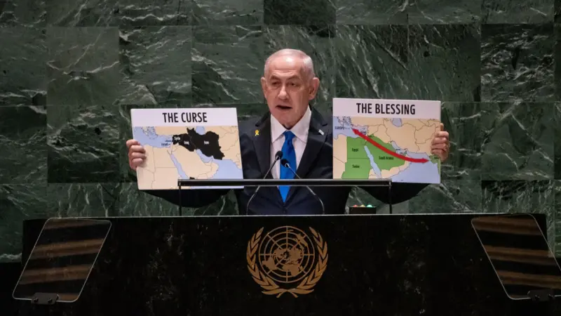 وخلال كلمته الأخيرة أمام الجمعية العامة للأمم المتحدة ظهر رئيس الوزراء الإسرائيلي حاملا خريطتين شملت الأولى مناطق تكتسي باللون الأخضر للدول التي تربطها اتفاقات سلام مع إسرائيل أو تخوض مفاوضات لتطبيع علاقاتها مع إسرائيل، وضمت مصر والسودان والإمارات والسعودية والبحرين والأردن.