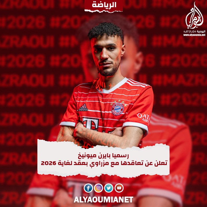 أعلن نادي بايرن ميونخ، بشكل رسمي، تعاقده مع الدولي المغربي، نصير مزراوي، حتى 2026، قادما إليه من نادي أجاكس أمستردام الهولندي، في صفقة انتقال حر.