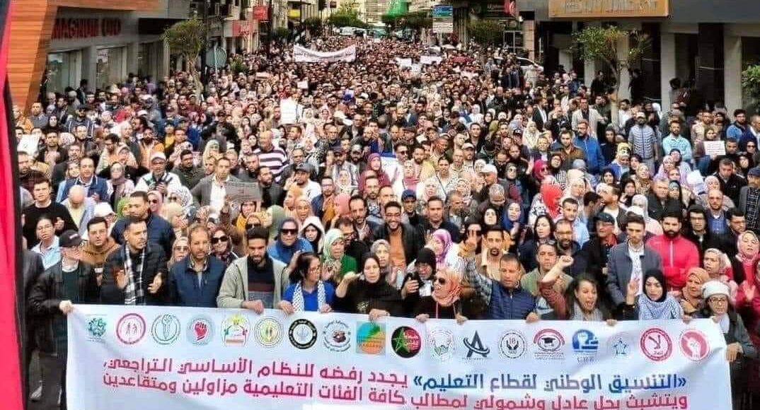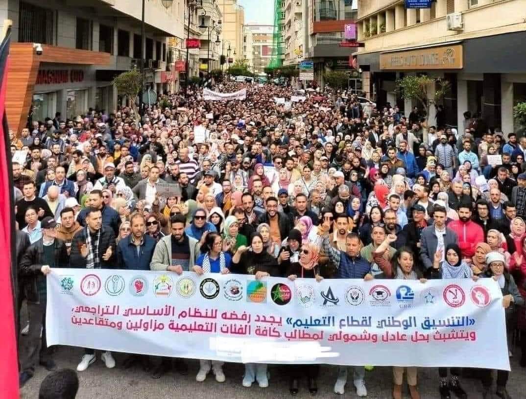 ومنذ الصباح توافد الأساتذة بالآلاف من مختلف جهات المملكة، للمشاركة في المسيرة الاحتجاجية التي انطلقت من أمام مبنى البرلمان في اتجاه مقر وزارة التربية الوطنية، مرورا بساحة باب الأحد.المسيرة التي تعد أكبر مسيرة احتجاجية تعليمية في السنوات الأخيرة، تأتي في أول أيام الإضراب الوطني الذي يخوضه الأساتذة بمختلف فئاتهم، والذي يستمر لثلاثة أيام، ويعد هو الثالث من نوعه خلال ثلاثة أسابيع، في حين تشهد الساحة التعليمية احتجاجات وإضرابات منذ الكشف عن مشروع النظام الأساسي قبل أزيد من شهر، وقبل ميلاد التنسيق الوطني للتعليم.