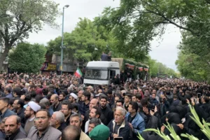 وشارك حشد كبير في نقل الجثامين من الميدان إلى ساحة المصلى، حيث ألقى أهالي تبريز نظرة الوداع على رئيسي والمسؤولين الآخرين الذين فقدوا حياتهم.